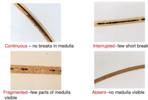 1. Continuous medulla– The pigment strand goes all the way down to the root without interruption. These are easy to treat.